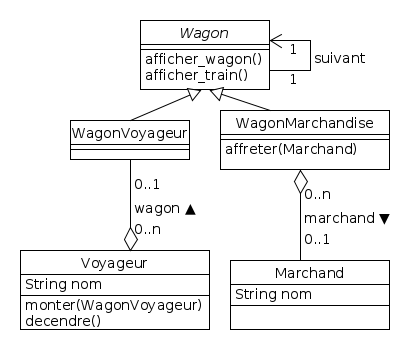 suivantdans le train afficher_wagonaffiche l’information complète d’un seul wagon.afficher_trainaffiche l’information complète du wagon et de tous les wagons suivants du train.affréteraffrète le wagon à un marchand. Si un autre marchand a déjà affrété le wagon, celui-ci libère le wagon. Si le marchand estnull, le wagon est libéré.monterfait monter le voyageur dans unwagon. Si le voyageur est déjà dans un autre wagon, il en descend automatiquementdescendrefait descendre le voyageur de son wagon. Si le voyageur n’est pas dans un wagon, rien ne se passe.